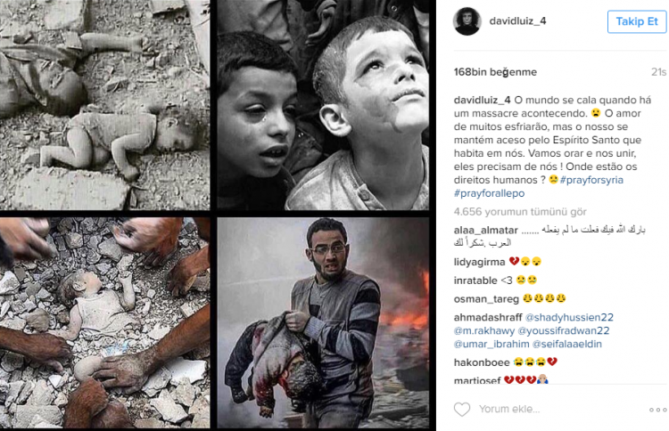 İngiltere Premier Lig ekibi Chelsea'de forma giyen Brezilyalı futbolcu David Luiz, Halep'te yaşanan katliama sessiz kalmadı.