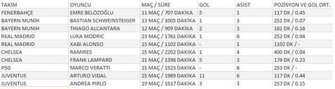 11 maçta 5 gol kaydeden sarı lacivertli yıldız, maç başında 0.45'lik bir gol ortalaması yakaladı ve 0.44 ortalamaya sahip en yakın takipçisi Juventuslu Vidal'i geride bıraktı. Şilili ortasaha oyuncusunun ardından gelen isim ise 0.23'lük ortalama ile Chelsea forması giyen Frank Lampard olurken, 4. sıraya ise 0.16'lık rakam ile Bundesliga ekiplerinden Bayern Münih forması giyen İspanyol oyuncu Thiago Alcantara oturdu.