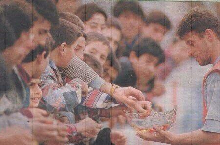 Tugay Kerimoğlu taraftarlara bayram şekeri dağıtıyor.