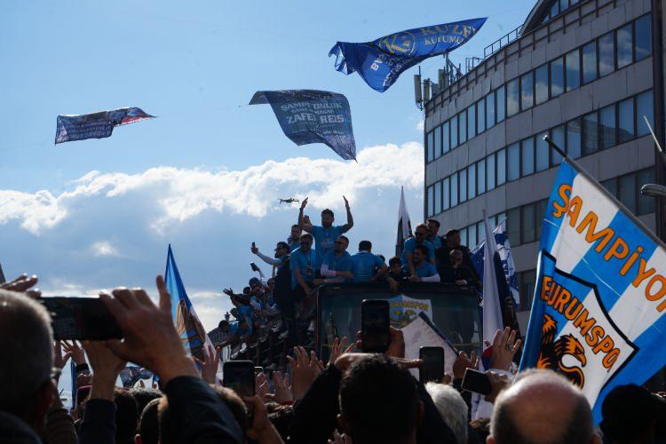 "Şampiyon Erzurumspor" tezahüratlarıyla yankılanan kentte, vatandaşlar futbolculara ve teknik yönetime sevgi gösterisinde bulundu.