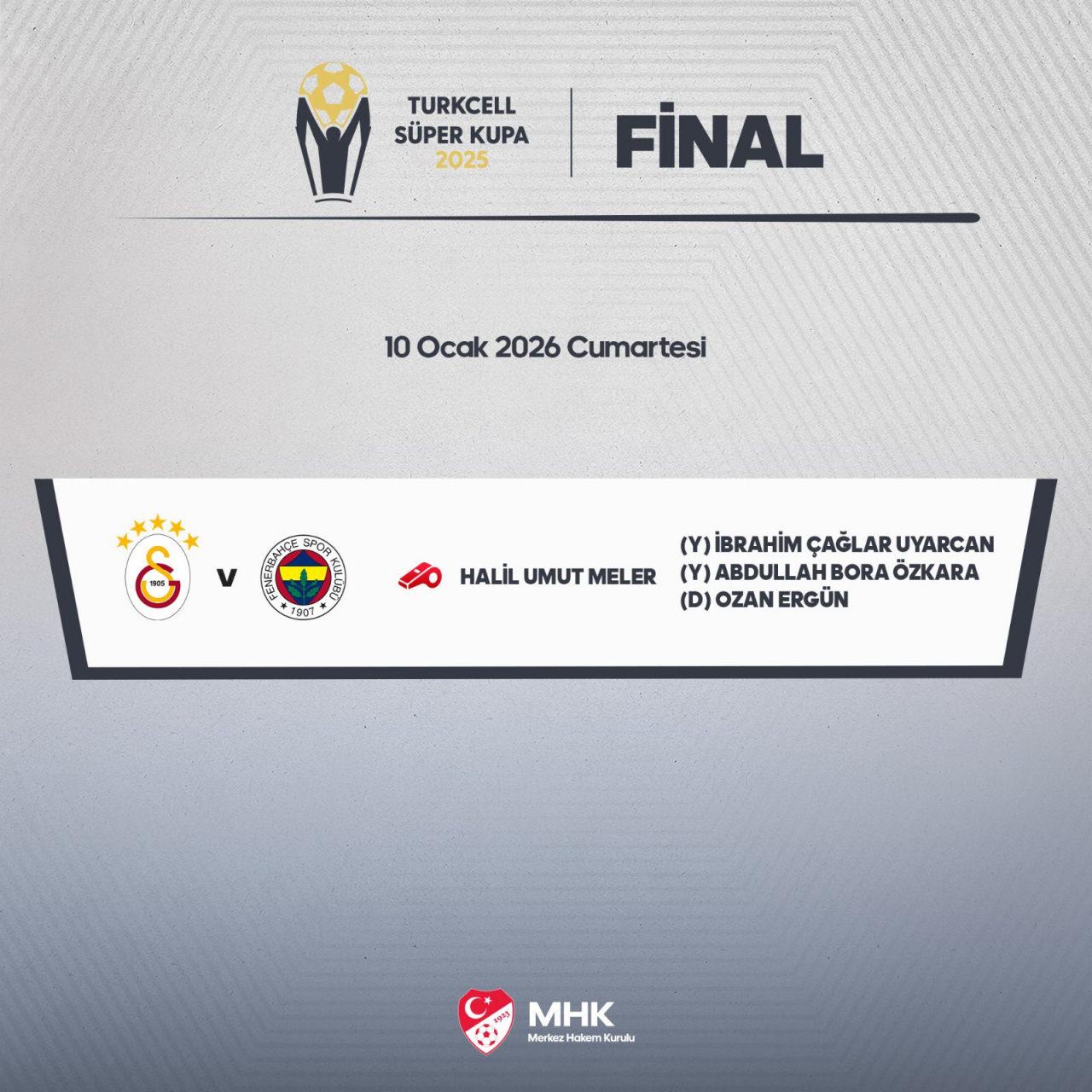 Dev derbiye sahne olacak Süper Kupa finalinin hakemleri de belli oldu. Merkez Hakem Kurulu, Galatasaray - Fenerbahçe arasında oynanacak Süper Kupa finalini Halil Umut Meler'in yöneteceğini açıkladı.