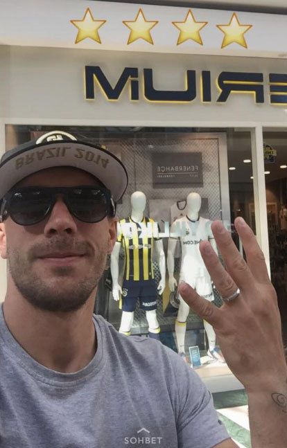 Sarı lacivertli kulübün lisanslı ürünlerinin satıldığı Fenerium'un önünde fotoğraf çektiren Podolski, eliyle "4" işareti yaptı. Süper Lig'de 20 şampiyonluğu bulunan Galatasaray, formasına 4 yıldız takan tek takım konumunda.