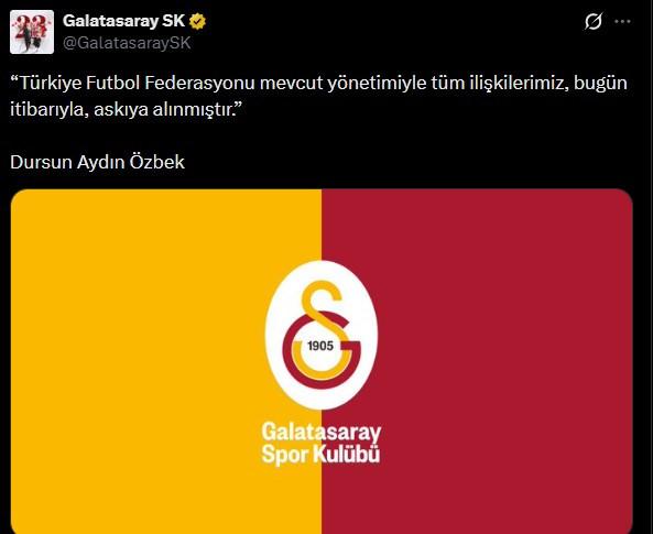 Sarı-kırmızılı takım, Başkan Dursun Özbek imzalı bir paylaşım yaptı. X'te yapılan paylaşımda “Türkiye Futbol Federasyonu mevcut yönetimiyle tüm ilişkilerimiz, bugün itibarıyla, askıya alınmıştır.” denildi.