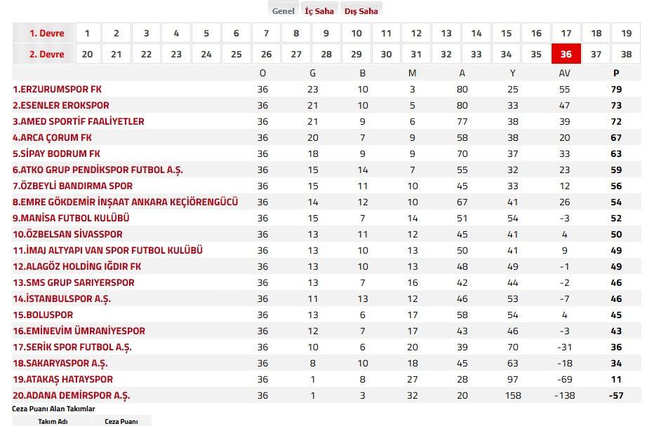 Not: Adana Demirspor'un 63 puanı silinmiştir.