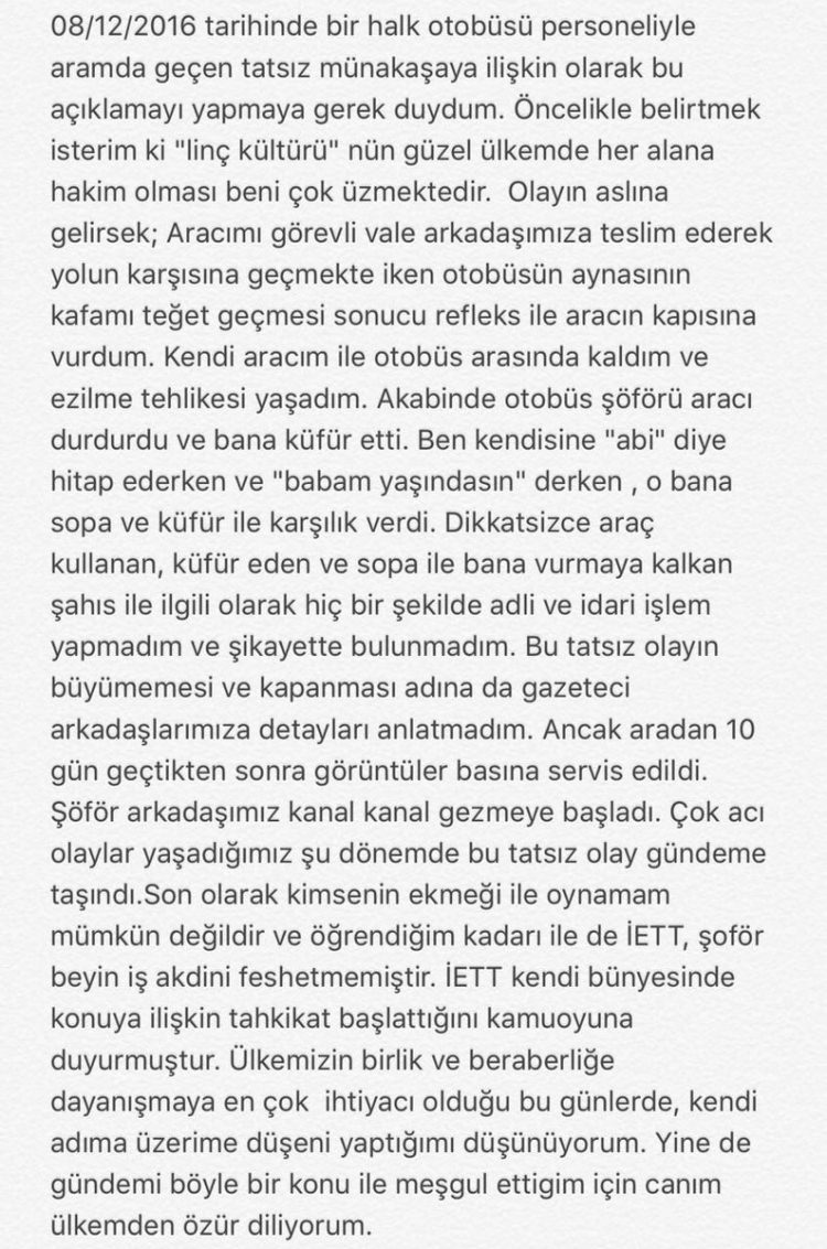 8 Aralık 2016 tarihinde bir halk otobüsü personeliyle aramda geçen tatsız münakaşaya ilişkin olarak bu açıklamayı yapmaya gerek duydum. Öncelikle belirtmek isterim ki 'linç kültürü'nün güzel ülkemde her alana hakim olması beni çok üzmektedir. Olayın aslına gelirsek; Aracımı görevli vale arkadaşımıza teslim ederek yolun karşısına geçmekte iken otobüsün aynasının kafamı teğet geçmesi sonucu refleks ile aracın kapısına vurdum. Kendi aracım ile otobüs arasında kaldım ve ezilme tehlikesi yaşadım. Akabinde otobüs şoförü aracı durdurdu ve bana küfür etti. Ben kendisine 'abi' diye hitap ederken ve 'babam yaşındasın' derken o bana sopa ve küfür ile karşılık verdi. Dikkatsizce araç kullanan, küfür eden ve sopa ile bana vurmaya kalkan şahıs ile ilgili olarak hiçbir şekilde adli ve idari işlem yapmadım ve şikayette bulunmadım. Bu tatsız olayın büyümemesi ve kapanması adına da gazeteci arkadaşlarımıza detayları anlatmadım. Ancak aradan 10 gün geçtikten sonra görüntüler basına servis edildi. Şoför arkadaşımız kanal kanal gezmeye başladı. Çok acı olaylar yaşadığımız şu dönemde bu tatsız olay gündeme taşındı. Son olarak kimsenin ekmeği ile oynamam mümkün değildir ve öğrendiğim kadarıyla da İETT, şoför beyin iş akdini feshetmemiştir. İETT kendi bünyesinde konuya ilişkin tahkikat başlattığını kamuoyuna duyurmuştur. Ülkemizin birlik ve beraberliğe, dayanışmaya en çok ihtiyacı olduğu bu günlerde kendi adıma üzerime düşeni yaptığımı düşünüyorum. Yine de gündemi böyle bir konuyla meşgul ettiğim için canım ülkemden özür diliyorum.