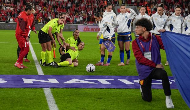 UEFA Uluslar B Ligi play-out rövanş müsabakasında Türkiye ile Kosova İzmir Gürsel Aksel Stadında karşılaşmasında ulusal marşlar okunurken maçın orta hakemi Michalina Diakow fenalaşarak yerde kaldı.