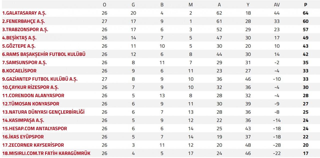 Süper Lig'de güncel puan durumu