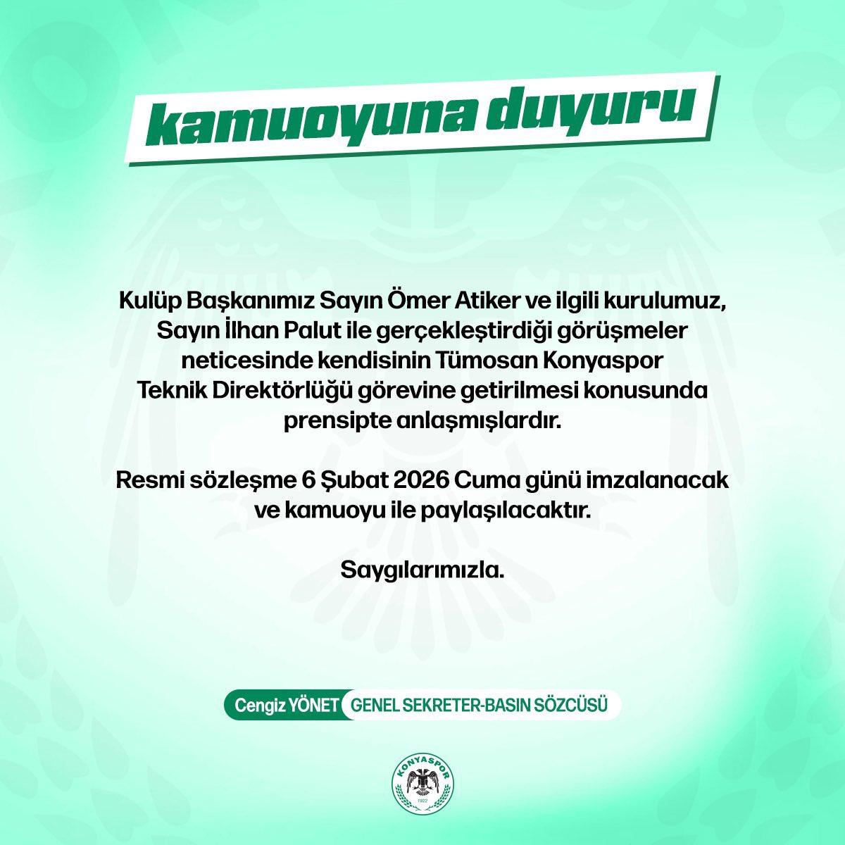 Konyaspor'dan yapılan açıklamada, "Kulüp Başkanımız Sayın Ömer Atiker ve ilgili kurulumuz, Sayın İlhan Palut ile gerçekleştirdiği görüşmeler neticesinde kendisinin Tümosan Konyaspor Teknik Direktörlüğü görevine getirilmesi konusunda prensipte anlaşmışlardır.