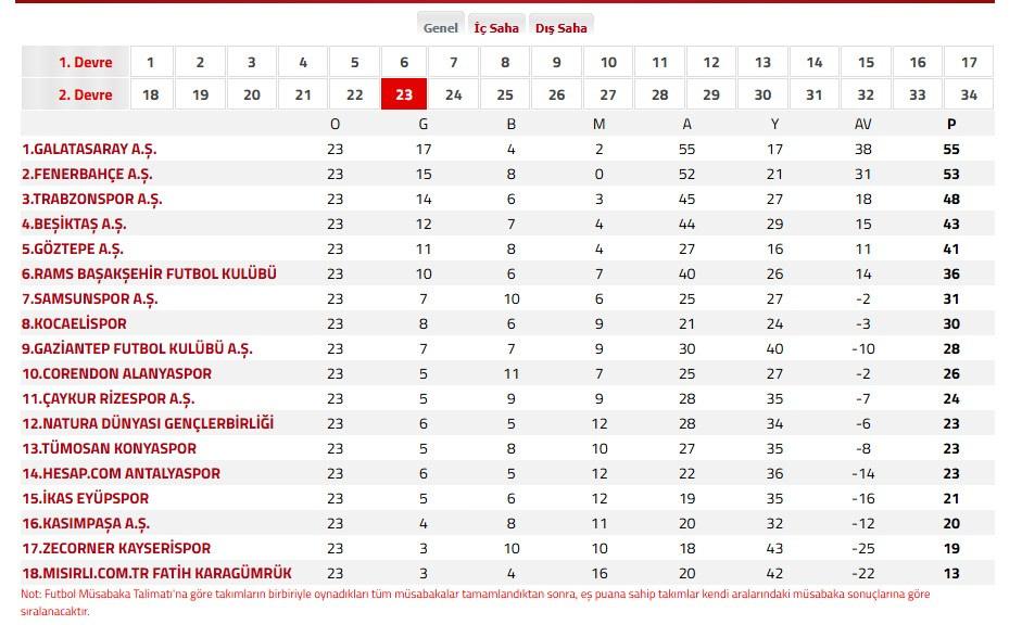 Trendyol Süper Lig'in 23. haftasının ardından puan durumu şöyle oluştu: