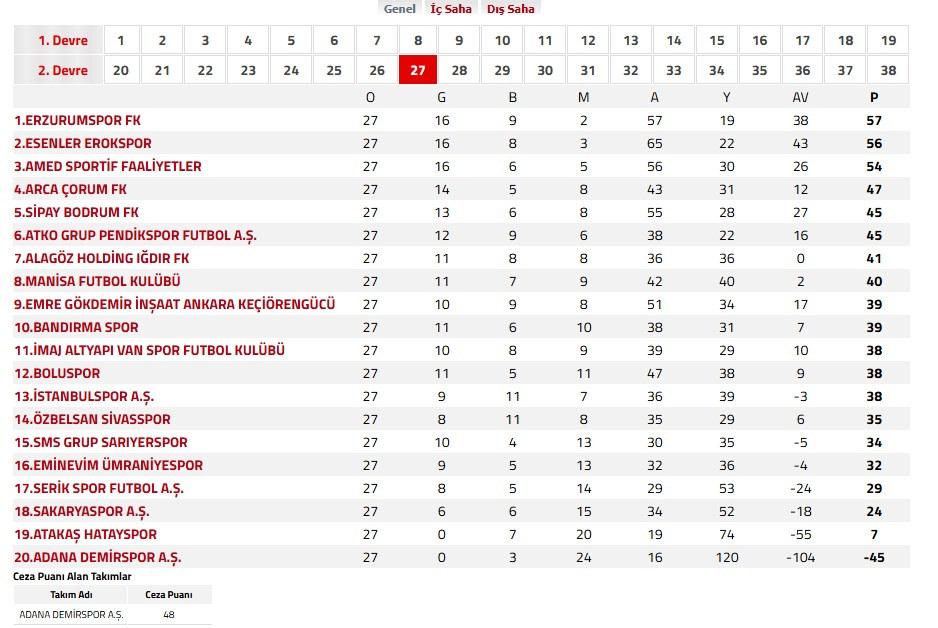 Not: Adana Demirspor'un 48 puanı silinmiştir.