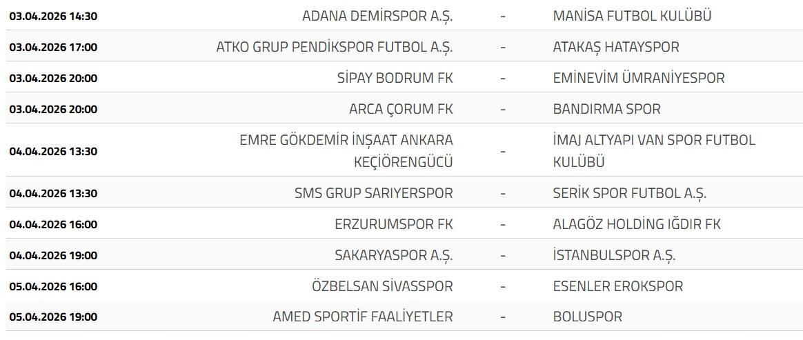 Gelecek hafta Erzurumspor sahasında Iğdır FK'yı konuk edecek. Esenler Erokspor ise deplasmanda Sivasspor'la karşılaşacak. Amedspor da evinde Boluspor'u ağırlayacak.