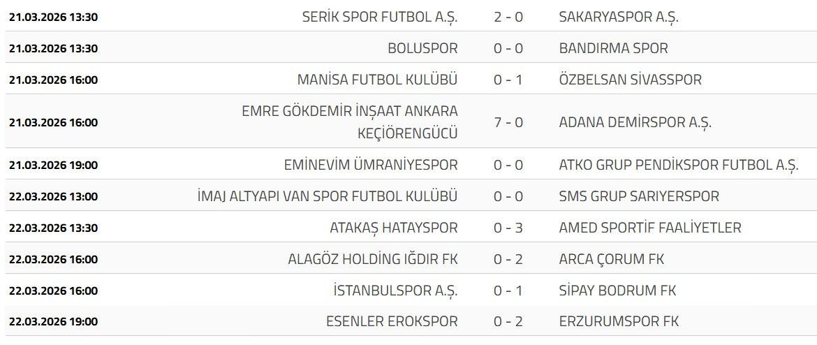 Play-off hattındaki ekiplerden Arca Çorum FK, Alagöz Holding Iğdır FK'yi deplasmanda 2-0 yenerek 62 puana yükseldi. Ligde 5. sırada bulunan Sipay Bodrum FK, İstanbulspor deplasmanından 1-0'lık galibiyetle ayrıldı.